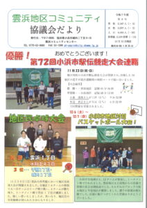 令和6年度の市民体育祭が10月20日日曜日に 小浜市総合運動場で開催されました 雲浜地区は綱引きやボール送りゲームなどで1位を獲得 また、大縄跳びでも2位に入るなど各種目で参加した地区民の皆さんが 大活躍していただき、み […]