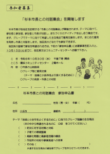 10月30日水曜日夜にコミュニティセンター2階ホールで杉本市長との対話集会が開催されました。一般公募に応募された約30人の市民の方と、雲浜地区の区長さんを中心に52名の参加で活発な意見の交換が行われ12地区共通テーマ「地 […]
